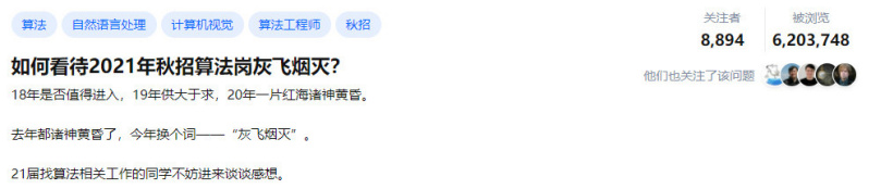 2021 届的秋招算法岗应聘人数更是剧增,导致网友发出感慨“如何看待 2021 年秋招算法岗位灰飞烟灭”。