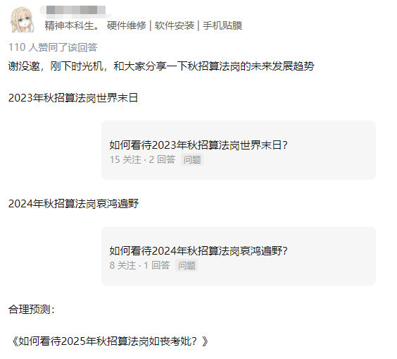 至于为什么会有“人间地狱的说法”,一位声称“坐时光机”回来的答主简单预测了下秋招算法岗位的未来发展趋势。然后他/她在蹲一个《如果给诸葛亮 100 个秋招算法 offer,能否北伐成功?》