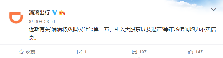 8 月 7 日消息 滴滴出行官方微博昨晚表示,近期有关“滴滴将数据权让渡第三方、引入大股东以及退市”等市场传闻均为不实信息。