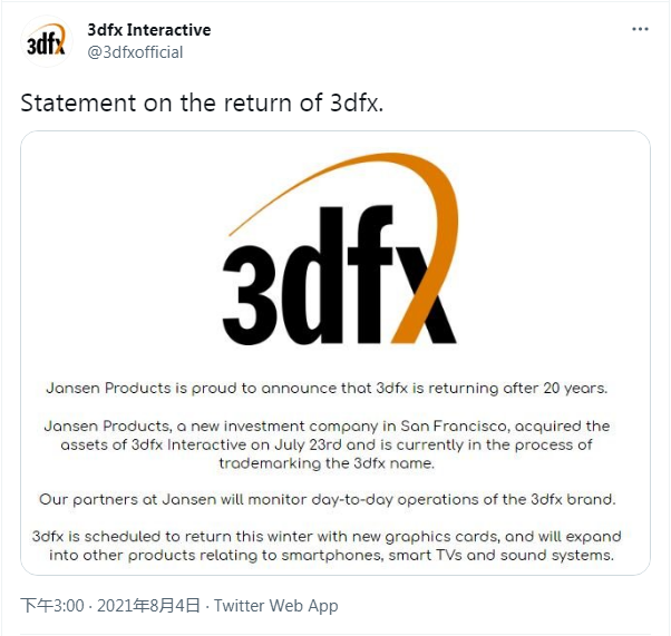 该账号的名称为 @3dfxofficial,宣称旧金山投资公司 Jansen Products 已于 7 月 23 日取得了 3dfx 的资产,目前正在获得 3dfx 商标的过程中。由于英伟达 CEO 黄仁勋的英文名是“Jansen Huang”,因此这个名称有恶搞的嫌疑。