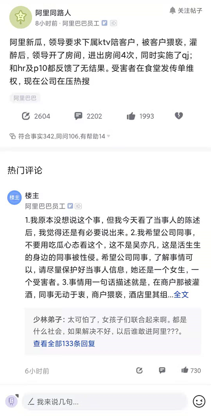 今晚在某社交平台上,一名认证“阿里巴巴员工”的网友发帖称,某领导要求员工陪客户,并实施了一系列违法行为,受害员工向公司反映无果,曾在食堂发传单寻求帮助。