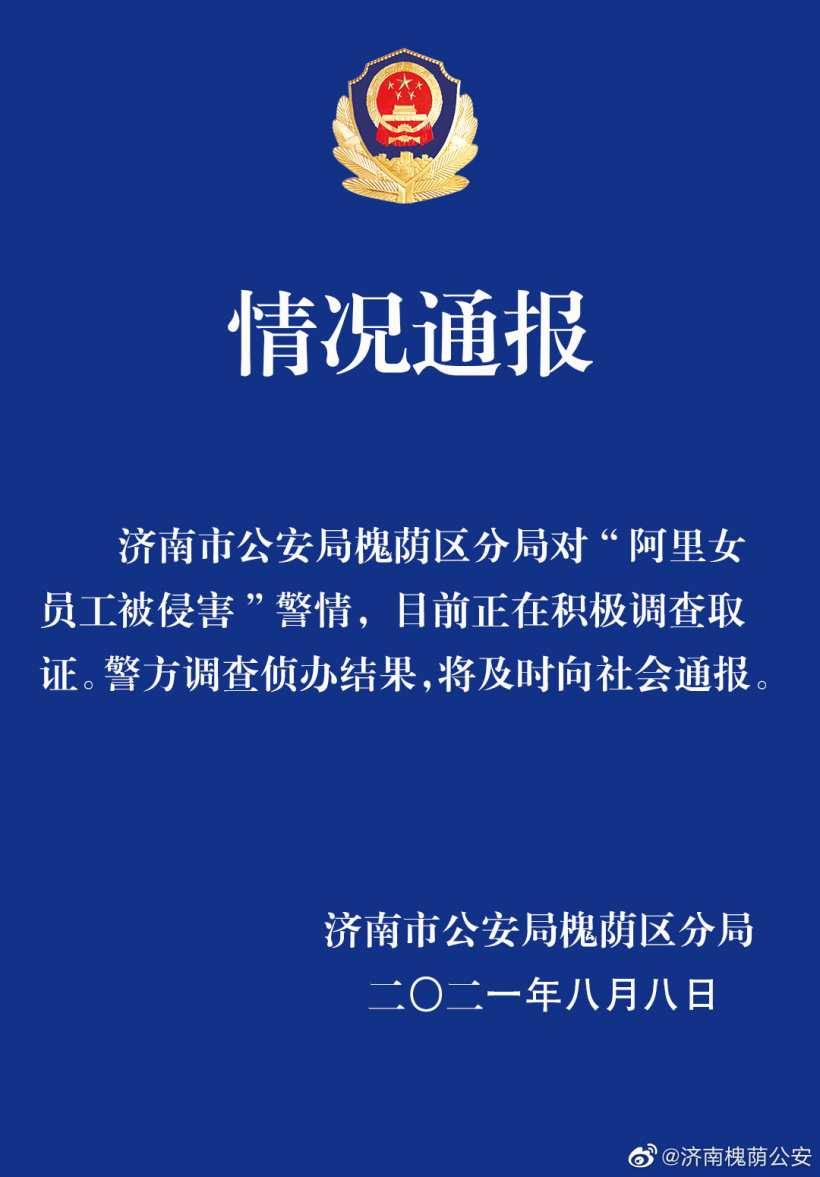 此外,济南市公安局槐荫分局表示,他们正在针对“阿里女员工被侵害”警情,目前正在积极调查取证。警方调查侦办结果,将及时向社会通报。