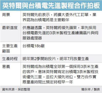 10 日消息 据中国台湾经济日报报道,台积电供应链透露,英特尔将领先苹果,率先采用台积电 3nm 制程生产绘图芯片、服务器处理器。明年 Q2 开始在台积电 18b 厂投片,明年 7 月量产,实际量产时间较原计划提早一年。