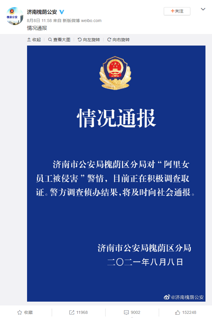 今日,济南警方在接受媒体采访时表示,“阿里女员工疑被侵害一案”因发生在私密空间,调查有难度。同时也请公众放心,警方调查侦办结果完成后,一定及时向社会公布。