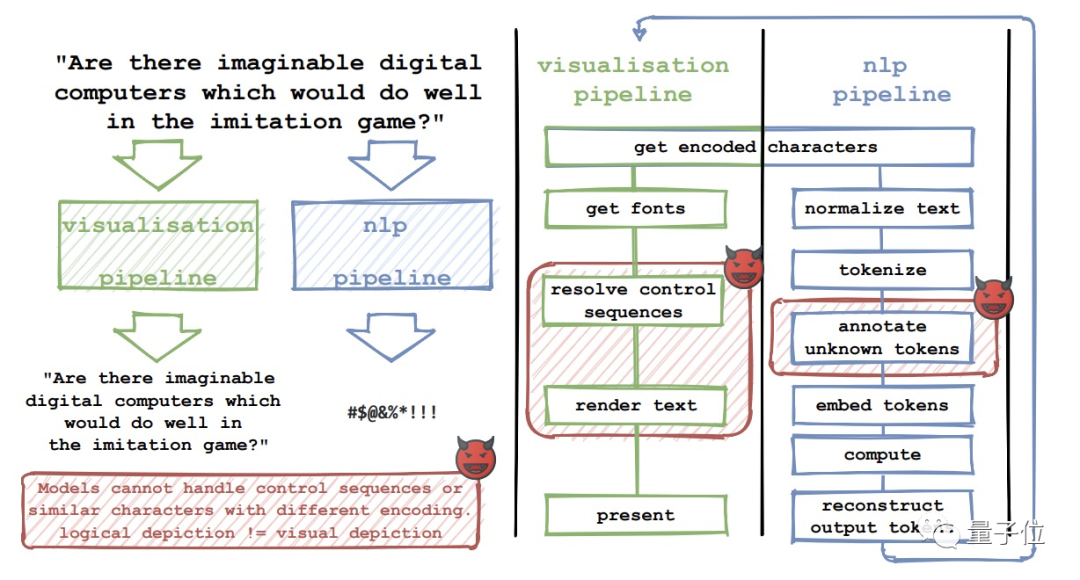 下图说明了文本可视化和 NLP 处理管道两者之间的差异是如何给对抗攻击留下可乘之机的: