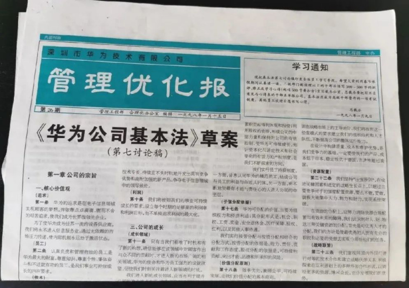 1996 年 3 月,华为公司邀请外部专家参与,共同成立了《华为基本法》起草小组。两年后,经过九易其稿,《华为基本法》最终于 1998 年 3 月 23 日定稿发布。