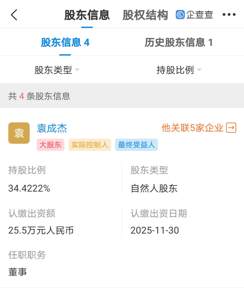 ,企查查显示,北京榴莲娱乐文化传播有限公司成立于 2015 年,袁成杰为该公司大股东,持股 34.4222%。