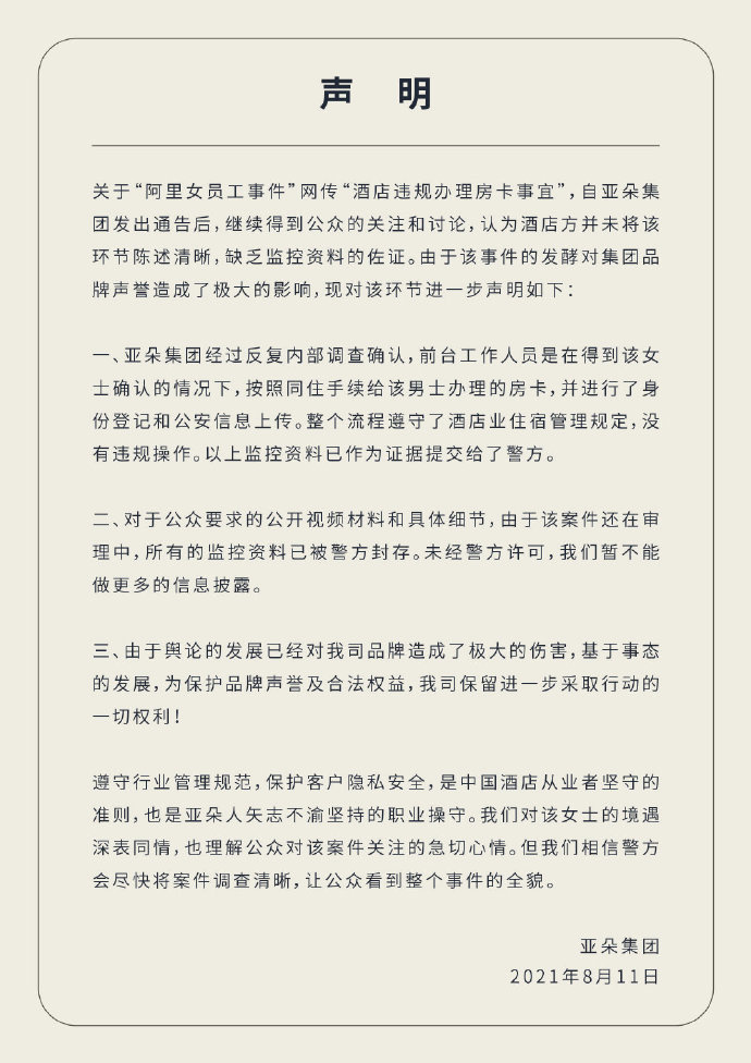 近日,“阿里女员工被侵害事件”持续引发热议。8 月 10 日晚,涉事亚朵酒店集团发布声明称前台员工遵守相关流程和规定,不存在违规制作房卡。今天下午,亚朵集团官方微博再次澄清表示,关于“阿里女员工事件”网传“酒店违规办理房卡事宜”,自亚朵集团发出通告后,继续得到公众的关注和讨论,认为酒店方并未将该环节陈述清晰,缺乏监控资料的佐证。由于该事件的发酵对集团品牌声誉造成了极大的影响,现对该环节进一步声明如下。