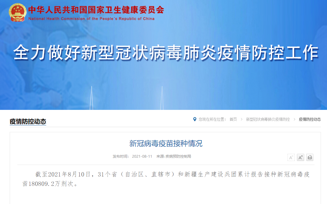 11 日消息 据国家卫健委官方网站在今日通报,截至 2021 年 8 月 10 日,31 个省(自治区、直辖市)和新疆生产建设兵团累计报告接种新冠病毒疫苗 180809.2 万剂次。