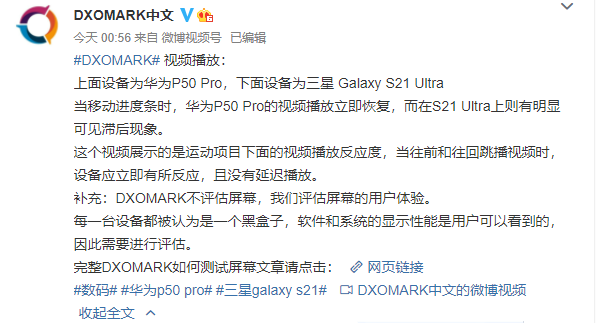 之后,他们又放出了一段视频播放对比,并表示 DXOMARK 不评估屏幕,我们评估屏幕的用户体验。最后他们认为华为手机没有播放延迟,而三星 S21 Ultra 上则有明显可见滞后现象所以不敌华为 P50 Pro。