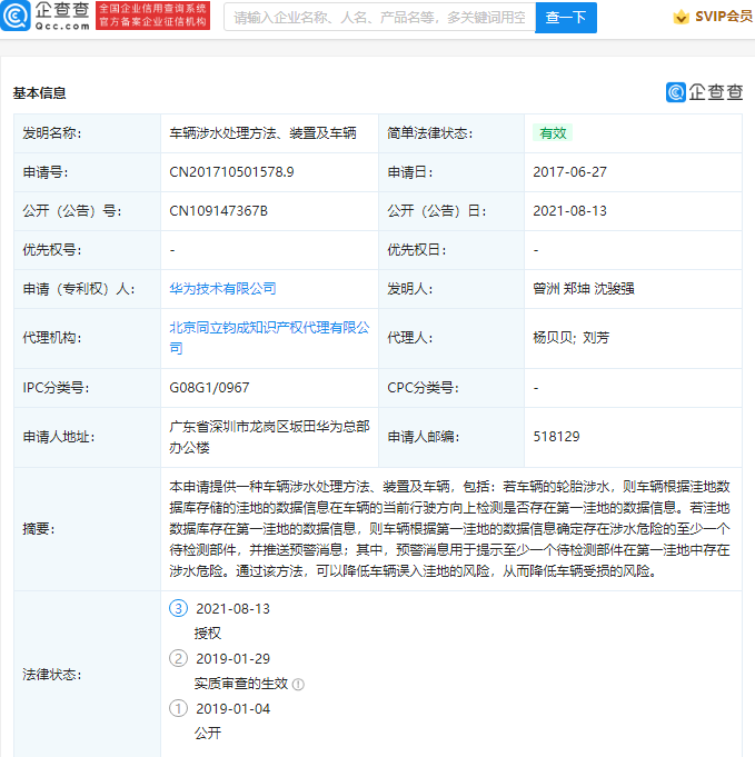 13 日消息 信息显示,8 月 13 日,华为技术有限公司“车辆涉水处理方法、装置及车辆”专利获授权,公开号为 CN109147367B。
