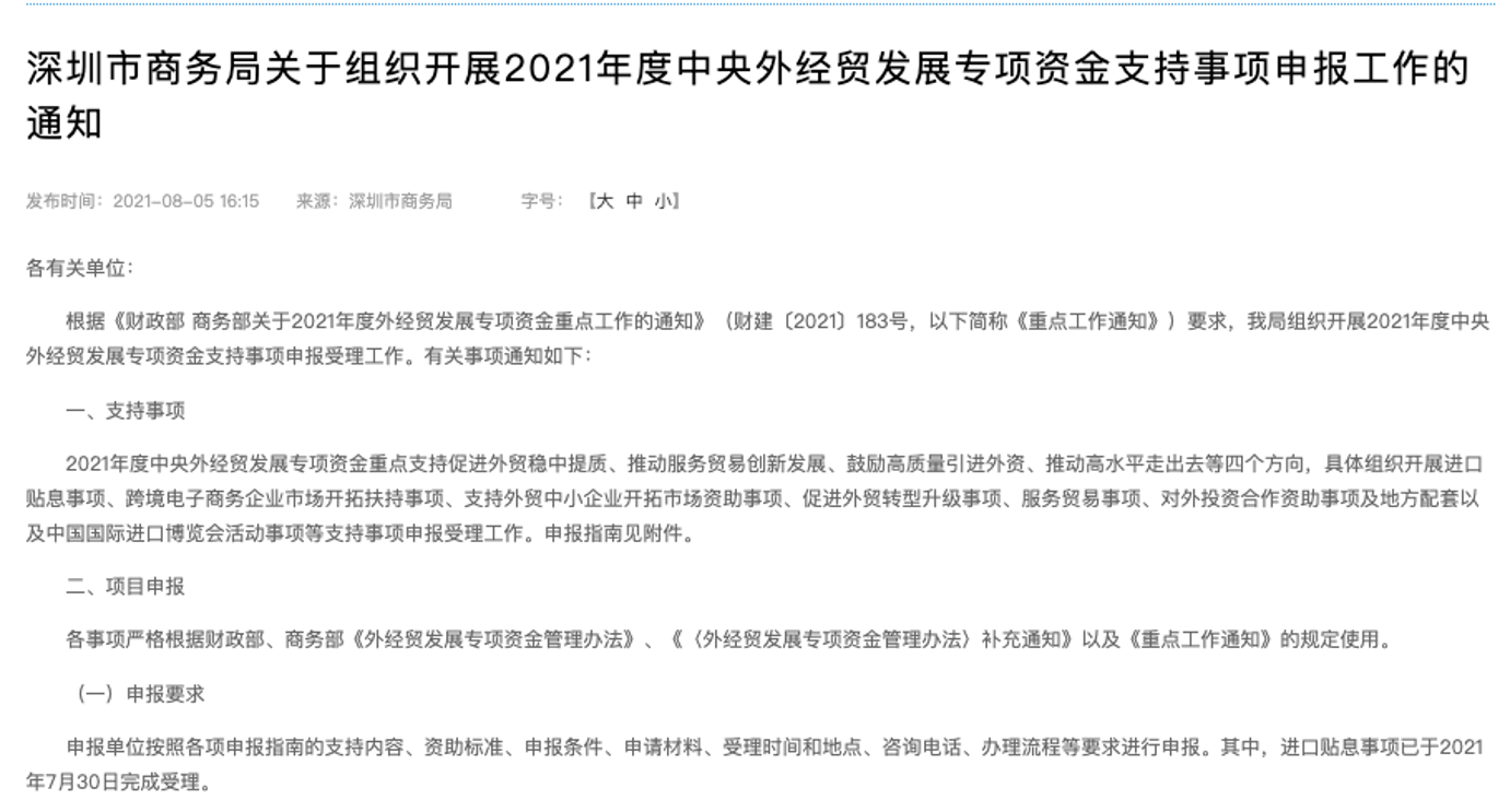 猎云网查询深圳市商务局官网发现,在 8 月 5 日发布的一则通知中就已经提及了这一扶持计划。