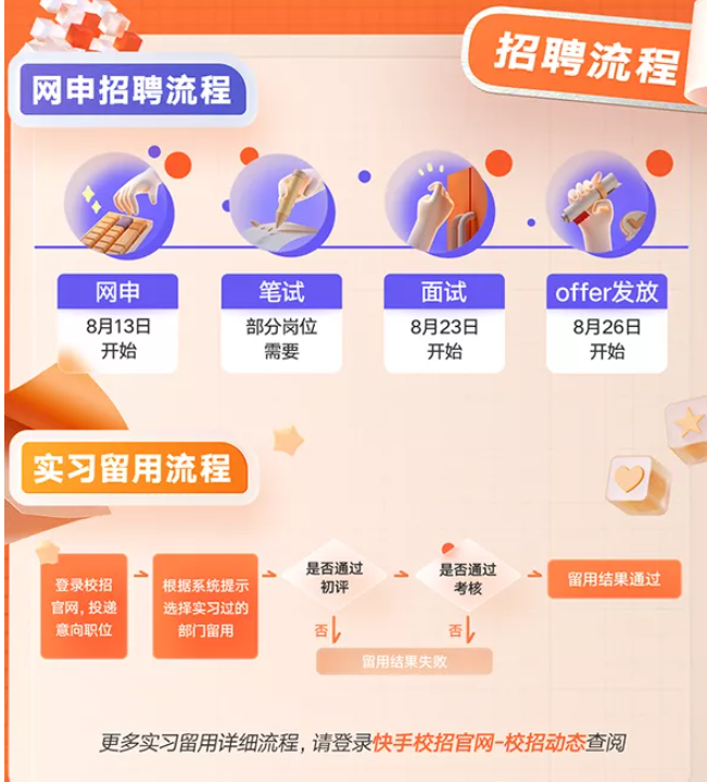 快手本次校园招聘的网申将于 8 月 13 日开始,部分岗位需要笔试,在通过笔试后,将于 8 月 23 日开始进行面试,而 offer 的发放日期则为 8 月 26 日。