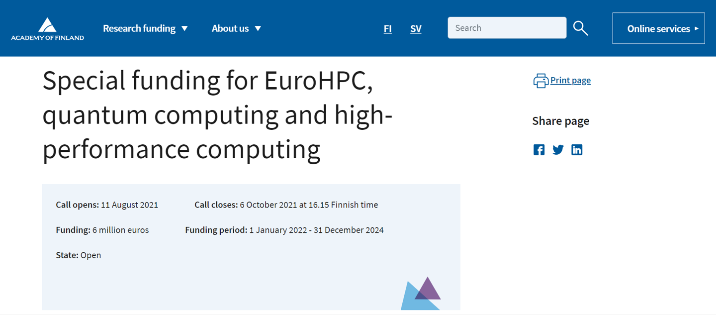 芬兰科学院启动一项 600 万欧元的专项资金,旨在支持 EuroHPC 超级计算基础设施的使用、量子计算机的引入和高性能计算的应用。相关电话会议于 8 月 11 日开始,并于 2021 年 10 月 6 日结束。