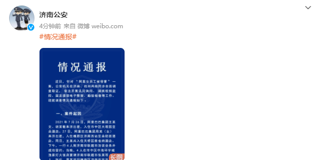 14 日消息 据济南公安官方微博,济南公安最新通报“阿里女员工被侵害”案称,王某文、张某涉嫌强制猥亵犯罪,无证据证明有强奸犯罪事实发生。案件正在进一步侦办中。