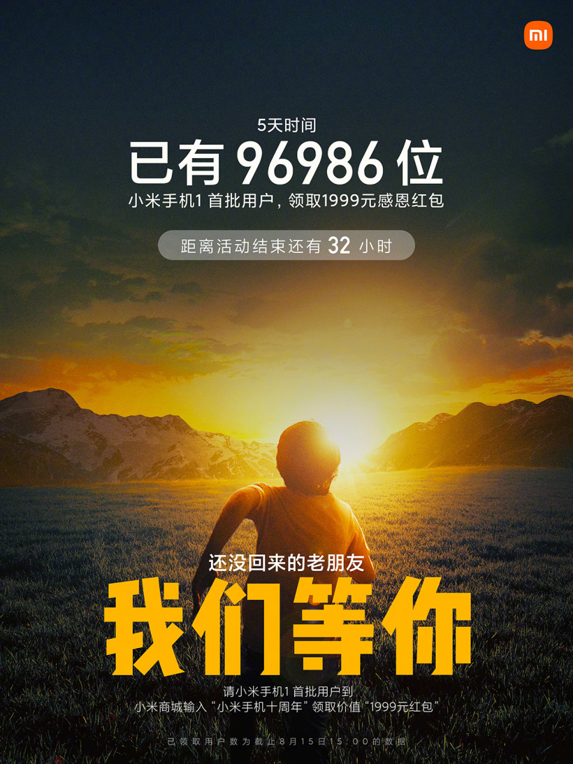 小米手机首批用户(2011 年 12 月 17 日前购买小米手机 1 的用户),在小米商城里输入“小米手机十周年“,即可领取 1999 元红包。该红包 8 月 16 日在小米商城中使用,无任何限制。