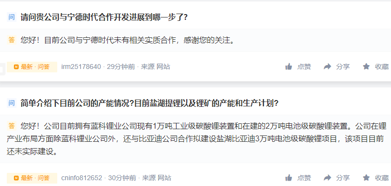 盐湖股份今日在互动平台表示,目前公司与宁德时代未有相关实质合作。公司目前拥有蓝科锂业公司现有 1 万吨工业级碳酸锂装置和在建的 2 万吨电池级碳酸锂装置。