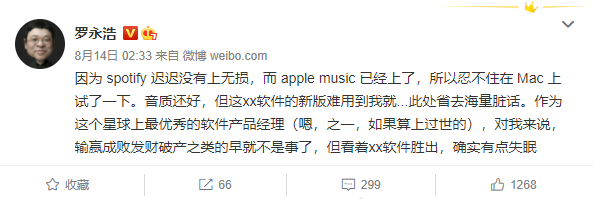 15 日消息 锤子科技 CEO 罗永浩发文吐槽苹果新版 Apple Music 不尽人意。罗永浩称,因为另一款音乐 App Spotify 迟迟没能支持无损音乐,而 Apple Music 已经有了,所以忍不住在 Mac 上试了一下。