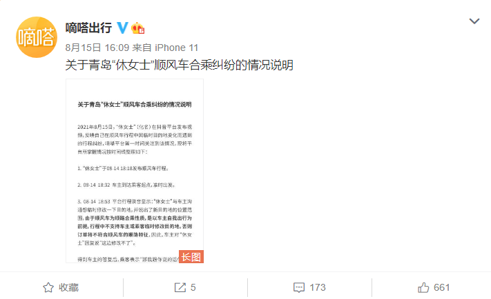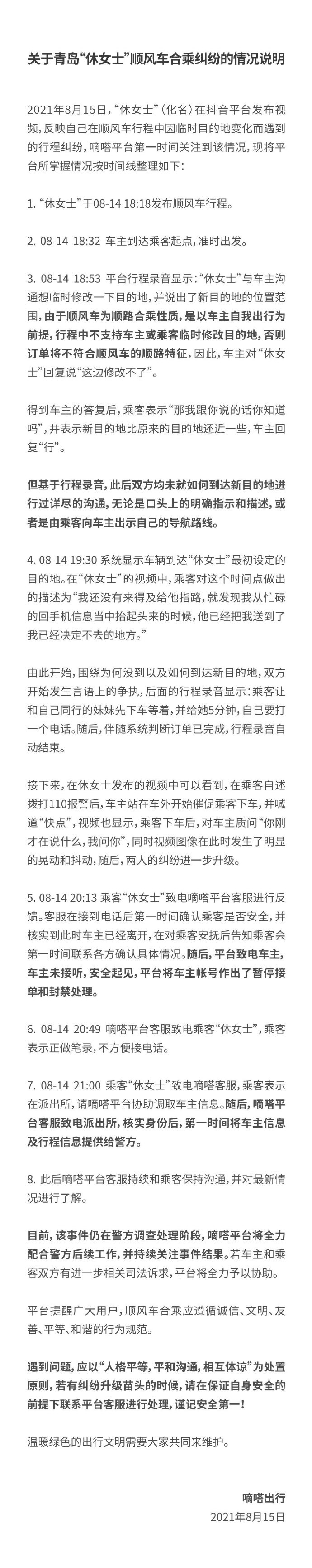 8 月 15 日,嘀嗒出行发布了关于青岛“休女士”顺风车合乘纠纷的情况说明。其中提及,“休女士”与车主沟通想临时修改一下目的地,并说出了新目的地的位置范围,由于顺风车为顺路合乘性质,是以车主自我出行为前提,行程中不支持车主或乘客临时修改目的地,否则订单将不符合顺风车的顺路特征,因此,车主对“休女士”回复说“这边修改不了”。