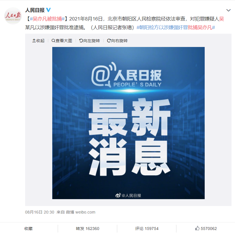 8 月 16 日晚间,北京市朝阳区人民检察院经依法审查,对犯罪嫌疑人吴某凡以涉嫌强奸罪批准逮捕。