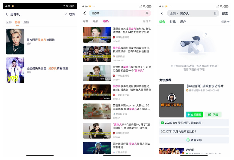 据IT之家测试,目前优酷、腾讯视频、爱奇艺等平台已经无法搜索吴亦凡等相关内容。