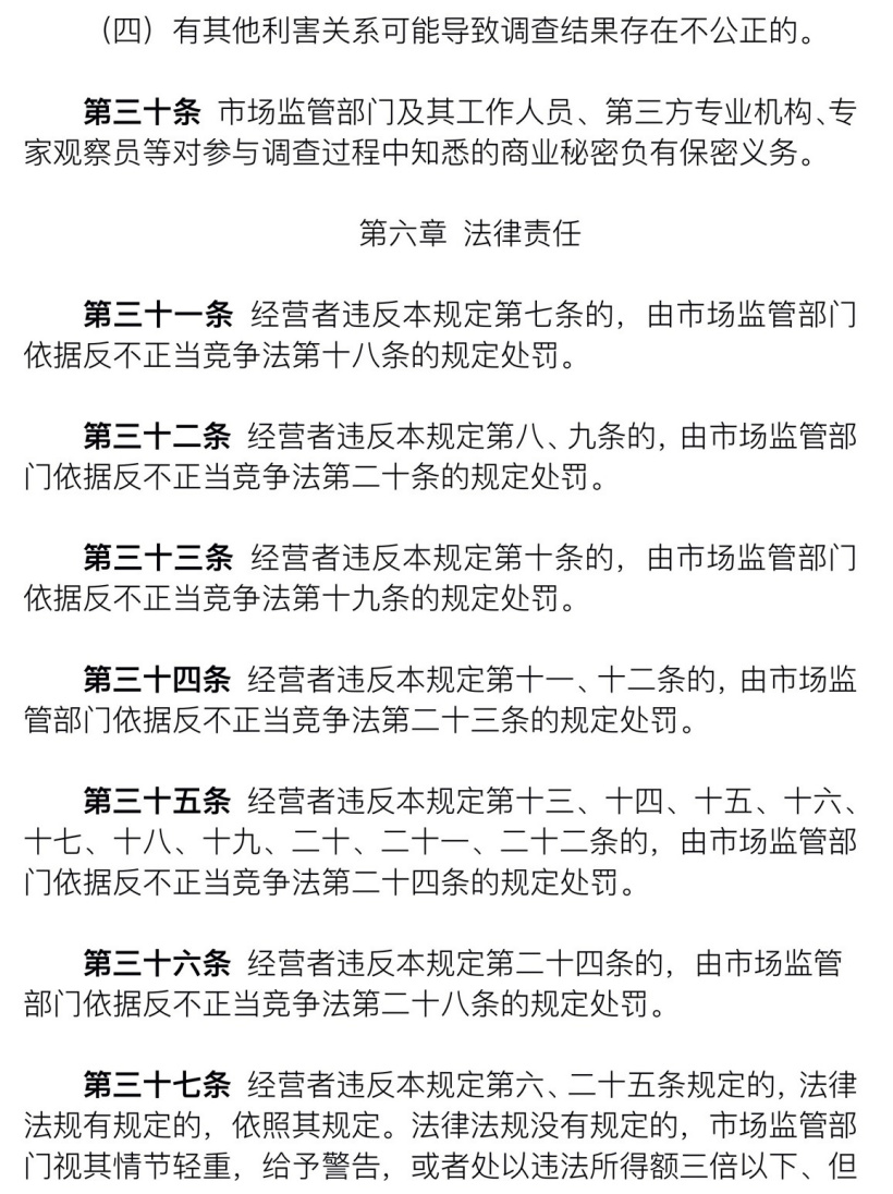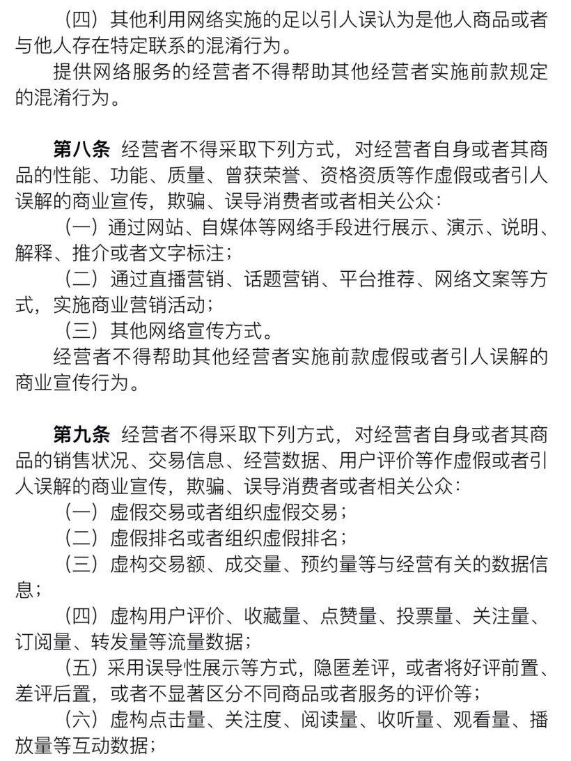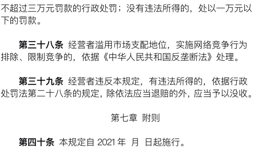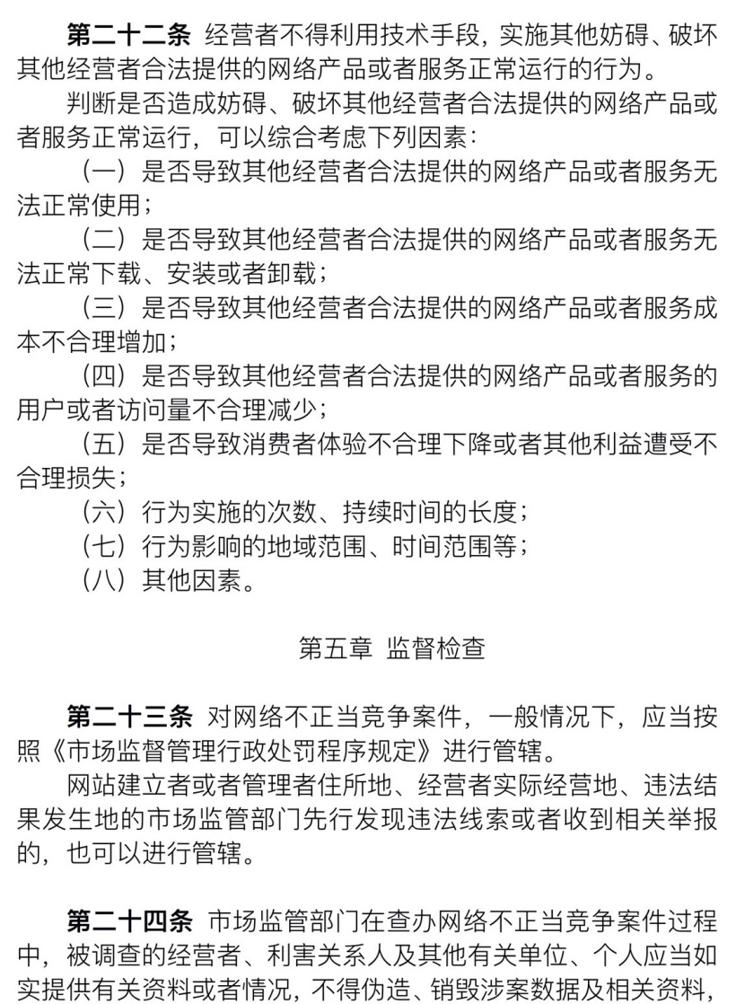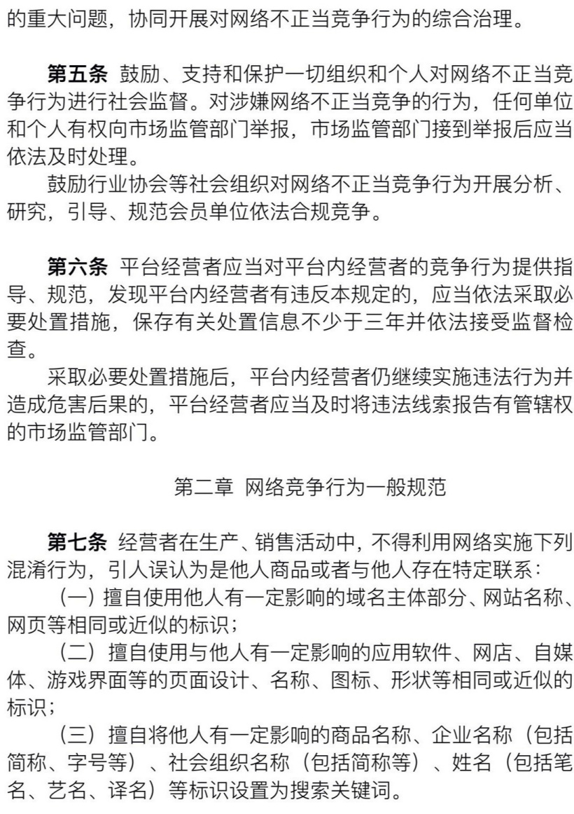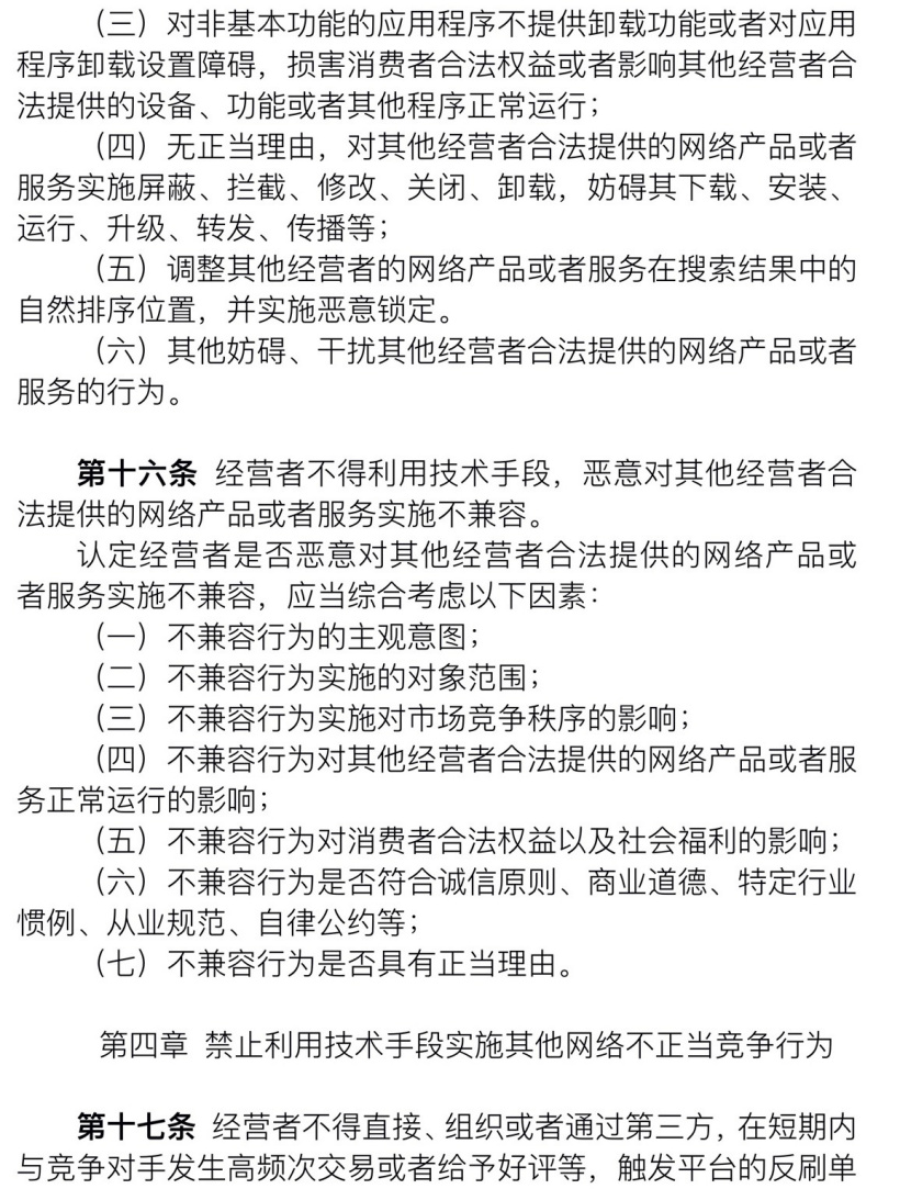市场监管总局还强调,经营者不得利用技术手段,通过影响用户选择、限流、屏蔽、商品下架等方式,减少其他经营者之间的交易机会,实施“二选一”行为,妨碍、破坏其他经营者合法提供的网络产品或者服务的正常运行,扰乱市场公平竞争秩序。