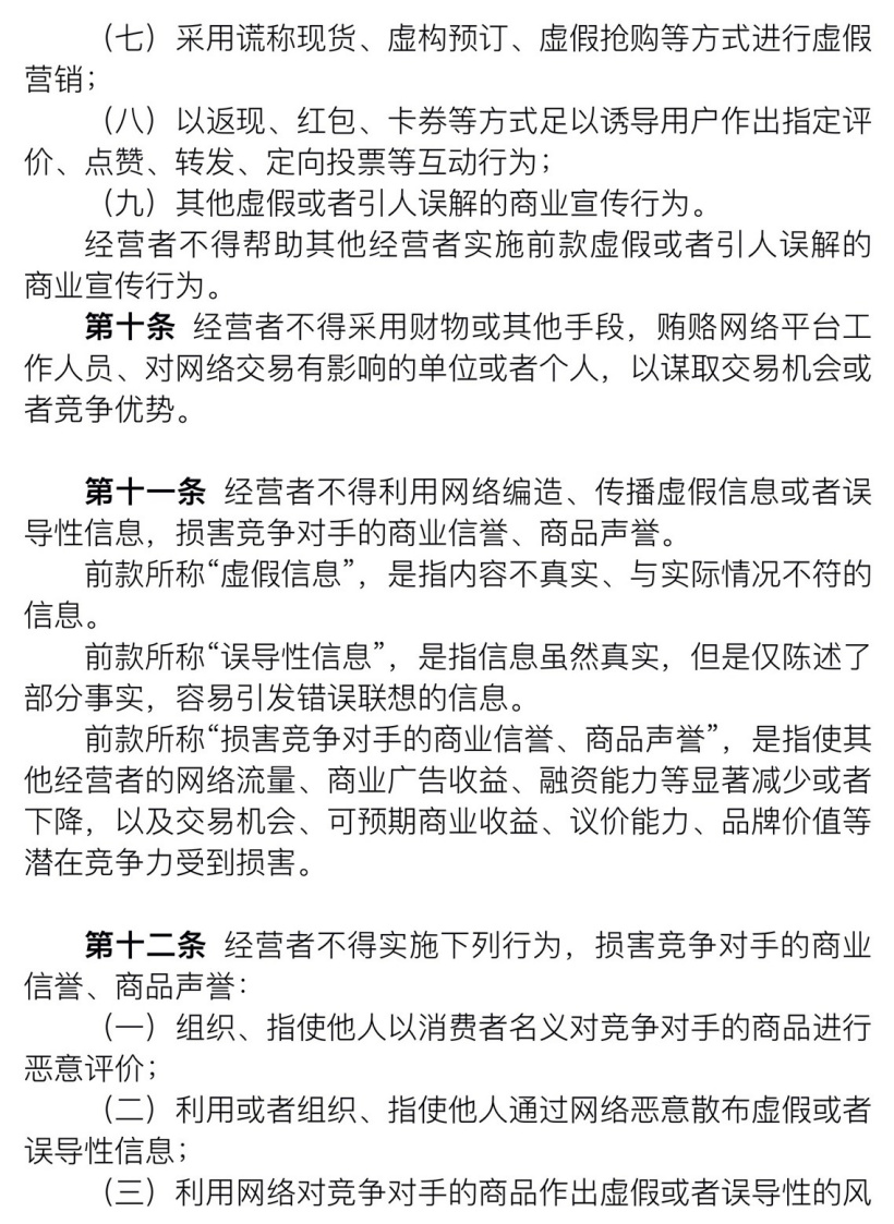 此外,经营者不得直接、组织或者通过第三方,在短期内与竞争对手发生高频次交易或者给予好评等,触发平台的反刷单惩罚机制,减少该竞争对手的交易机会。