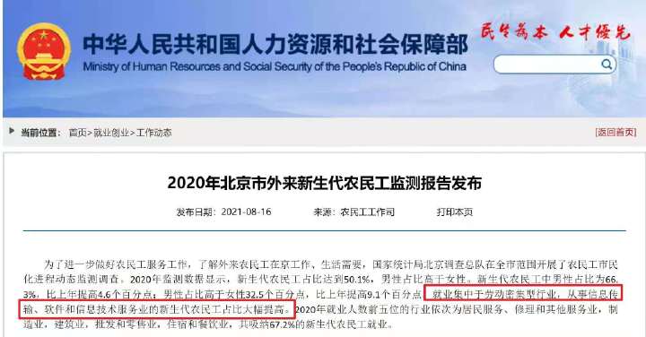 17 日消息 据人力资源和社会保障部 8 月 16 日发布的信息,2020 年北京市外来新生代农民工监测报告已于近日发布。