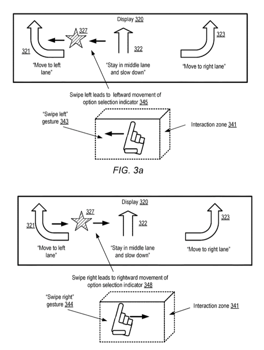苹果在今年 2 月获得的一项名为《基于手势控制的自动驾驶汽车》专利显示,自动驾驶车辆能够基于驾驶员隔空指令控制车辆变道。这一功能适用于 L2 和 L3 级自动驾驶,驾驶员如果希望主动控制车辆,可以通过手势、语音,甚至眼神控制车辆变道。