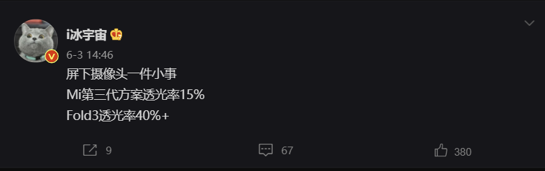 知名数码博主冰宇宙曾透露,三星的屏下摄像方案透光率可以达到 40%,而小米第三代屏下摄像方案的透光率则为 15% 左右。