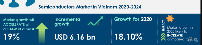 爱尔兰市场研究公司 Technavio 的数据显示,2020 年至 2024 年,越南半导体市场预计将增长 61.6 亿美元(约合 399.38 亿人民币),年复合增长率达 19%。由于半导体的高附加值特性,这也将带动越南的许多产业发展。