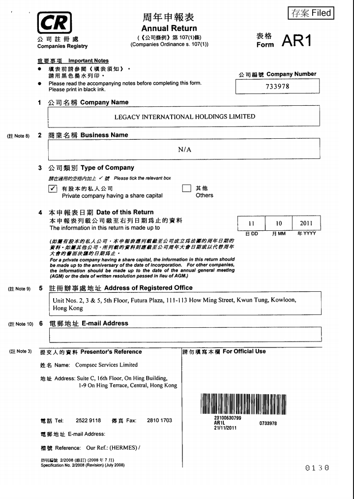 相关资料显示,LEGACY INTERNATIONAL HOLDINGS LIMITED(中国香港)在 2011 年 10 月提交最后一次公司申报表后,便再无更新,目前已处于解散状态。