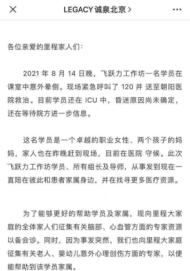 值得注意的是,LEGACY 飞跃力官方公众号也在 8 月 15 日发文称,有一名女性学员意外晕倒,已送往医院抢救。飞跃力公告中描述,该学员是一个卓越的职业女性、两个孩子的妈妈。而 DCM 内部人士向媒体确认了这一消息,并确认其是在工作之外参加 LEGACY 课程中晕倒的,但并未透露具体死因。
