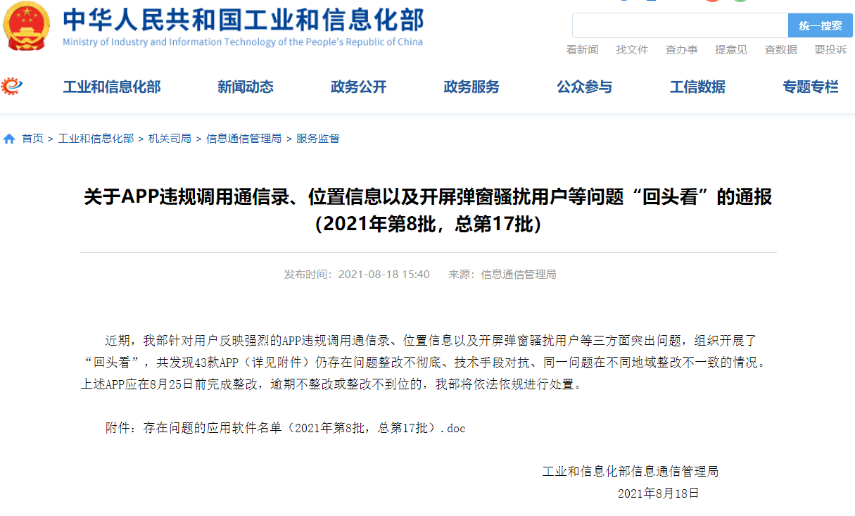 18 日消息 今日下午,工信部发布了关于 App 违规调用通信录、位置信息以及开屏弹窗骚扰用户等问题“回头看”的通报(2021 年第 8 批,总第 17 批)。