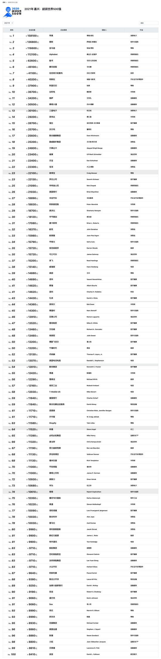 其中,苹果公司以 15.8 万亿价值蝉联“胡润世界 500 强”榜首,比去年榜单发布时增长 15%。微软、亚马逊和 Alphabet 分别以 13.7 万亿、11.7 万亿和 11.2 万亿位列第二至第四。