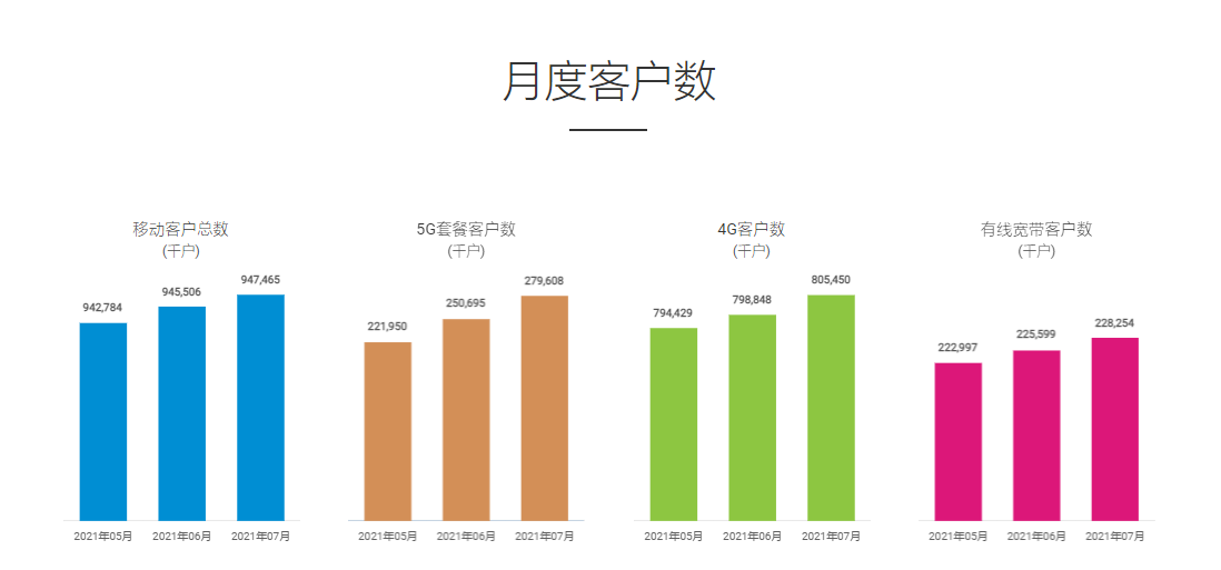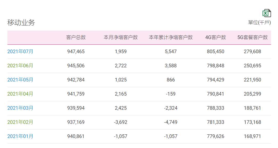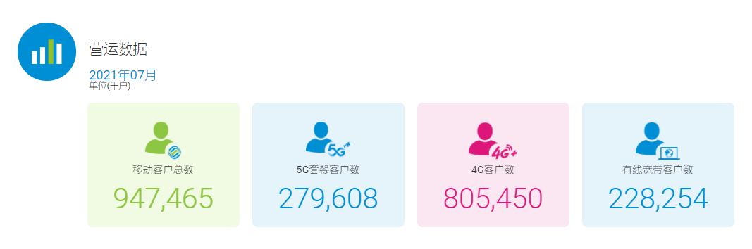 中国移动今日公布了 2021 年 7 月份运营数据,当月,中国移动移动客户数净增 195.9 万户,用户总数达到 9.47465 亿户。其中,5G 套餐客户数为 2.79608 亿户,4G 客户数约 8 亿户。