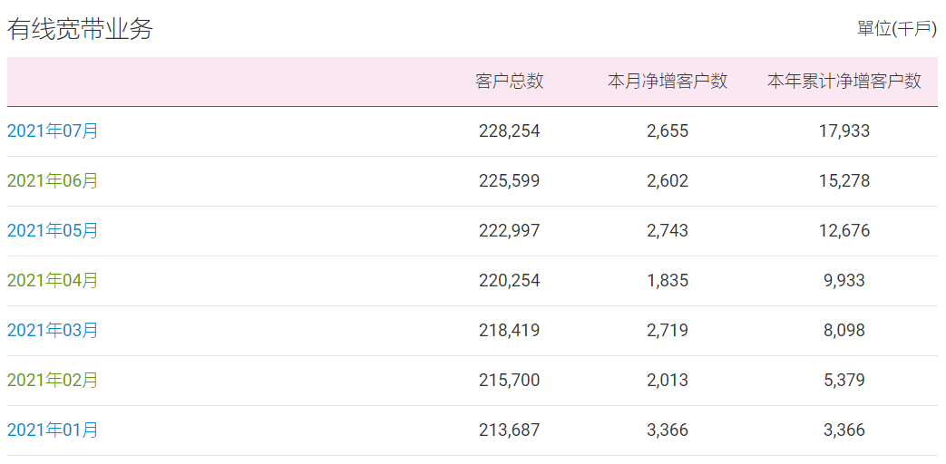 7 月中国移动有线宽带客户数净增 265.5 万户,累计达到 2.28254 亿户。