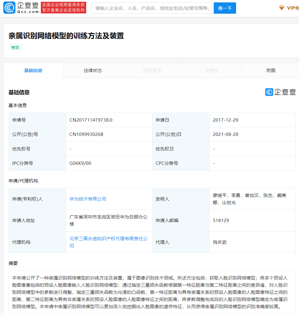 企查查专利摘要显示,本申请中亲属识别网络模型可以更加深入地挖掘出人脸图像的遗传特征,从而使得亲属识别网络模型的识别准确度较高。
