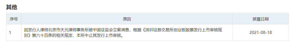 本次中止的原因则是发行人律师北京市天元律师事务所被中国证监会立案调查。