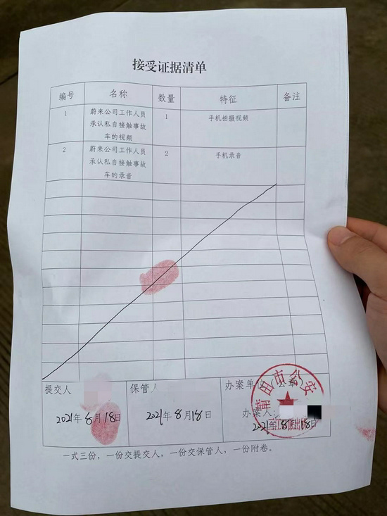 从新浪拿到的当事人家属出示的材料来看,他们一共向警方提供了两份证据,现已获得认可。其中一份是蔚来工作人员承认私自接触车辆的视频,一段是蔚来工作人员承认私自接触车辆的录音。