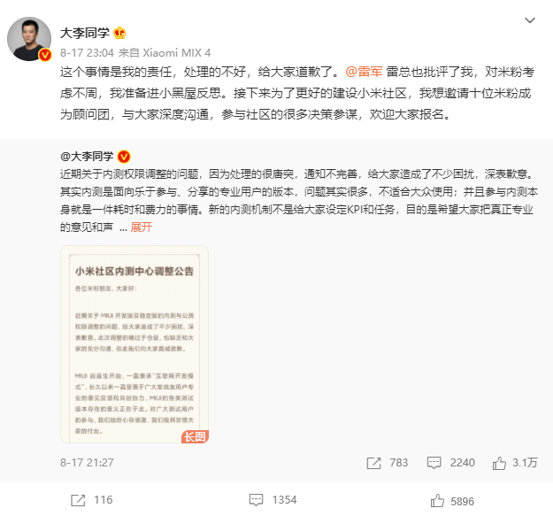 小米公司用户平台部总经理李明回复表示,大家意见我们都在看,会认真分析。感谢各位。