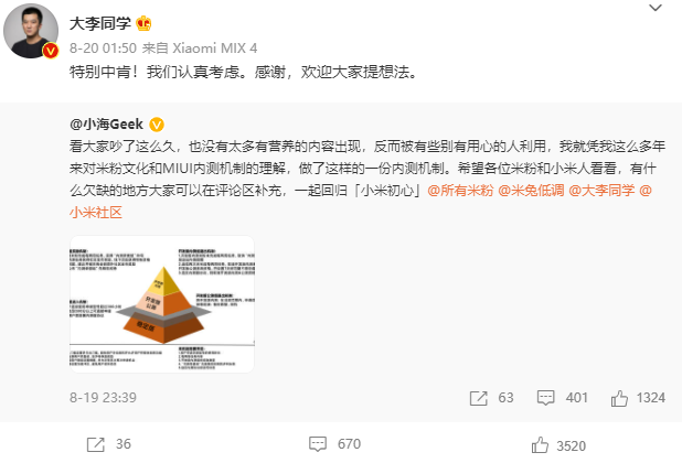 此外,他之前也表示欢迎大家提出看法,并想邀请十位米粉成为顾问团,与大家深度沟通,参与社区的很多决策参谋。