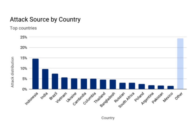 Cloudflare 公司对自己的表现十分满意,得益于其自动的边缘 DDoS 保护系统,这种规模攻击的影响被大大缓解。该公司表示,本次攻击与上周发生的另一起 DDoS 攻击事件来源相同,上一次峰值达到了 800 万 rps。具体来看,本次攻击事件绝大多数地址来自于印度尼西亚,占比 15%,其次包含印度、巴西、越南等国家和地区。以下为列表: