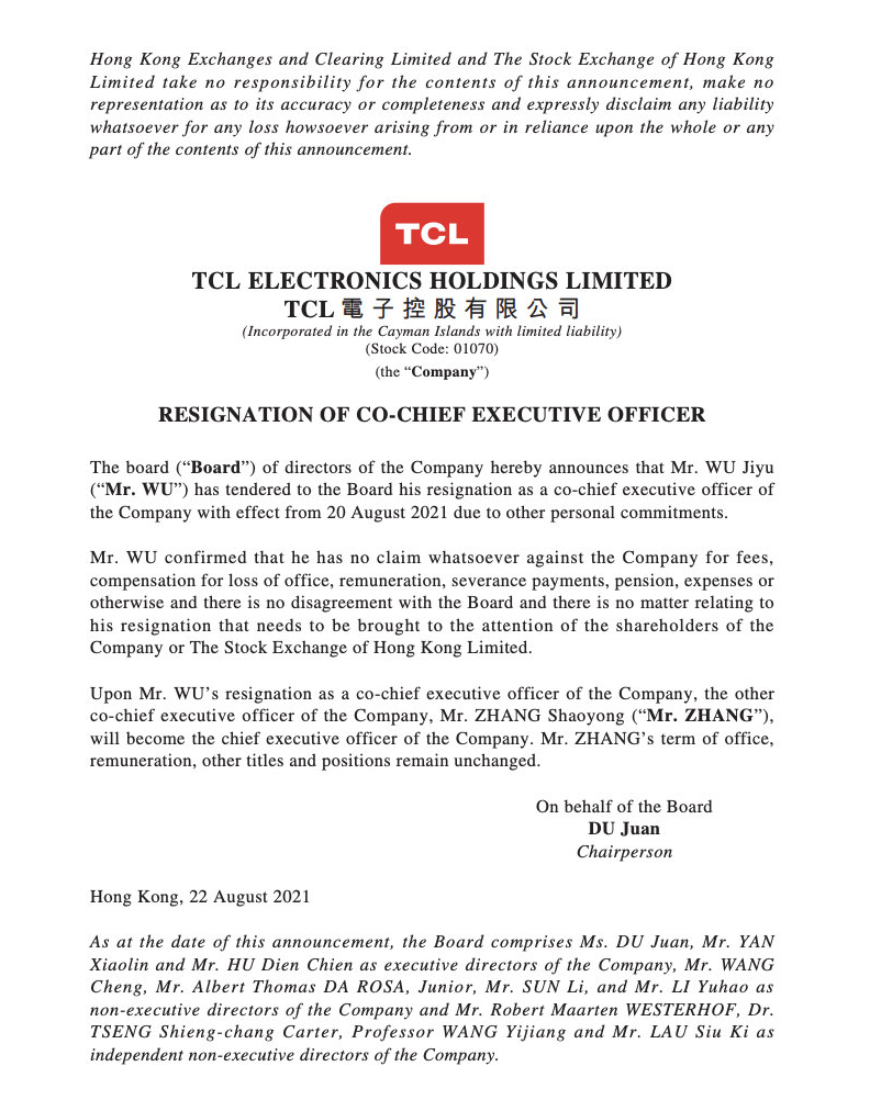 TCL 电子在 8 月 9 日还发布公告,董事会发生变更,吴吉宇及张少勇已获委任为联席首席执行官,自 2021 年 8 月 9 日起生效。
