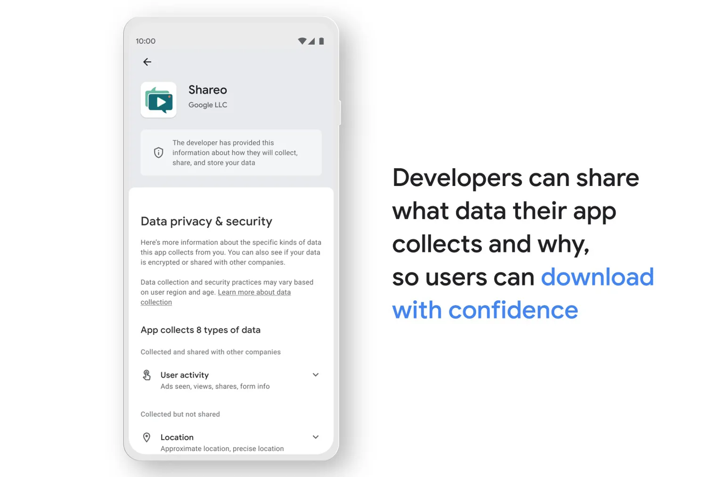 今年七月,谷歌透露了更多关于 Play Store 应用商店中即将上线的新隐私政策「安全单元」(Safety Section)更新的上线细节:谷歌将在 2022 年在 Play Store 中的应用下载界面中,加入一个用于「帮助用户了解应用会收集哪些个人数据」的板块。