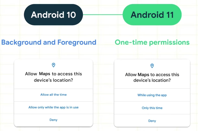 从 Android 10 开始,Android 就开始一步步收紧 Android 关键权限的应用授权:Android 10 限制了应用获取手机的 IMEI 信息,同时加入更加细分的位置权限授予机制;Android 11 中加入了进一步收紧手机存储空间权限的「沙盒」机制来阻止应用在公开目录中存储隐私数据并相互交换,以及针对地理位置信息、麦克风/相机等关键隐私权限加入「单次授权」选项。
