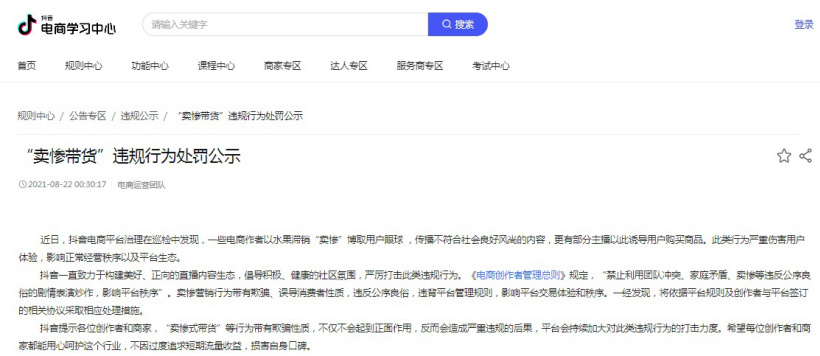 《电商创作者管理总则》规定,“禁止利用团队冲突、家庭矛盾、卖惨等违反公序良俗的剧情表演炒作,影响平台秩序”。卖惨营销行为带有欺骗、误导消费者性质,违反公序良俗,违背平台管理规则,影响平台交易体验和秩序。一经发现,将依据平台规则及创作者与平台签订的相关协议采取相应处理措施。