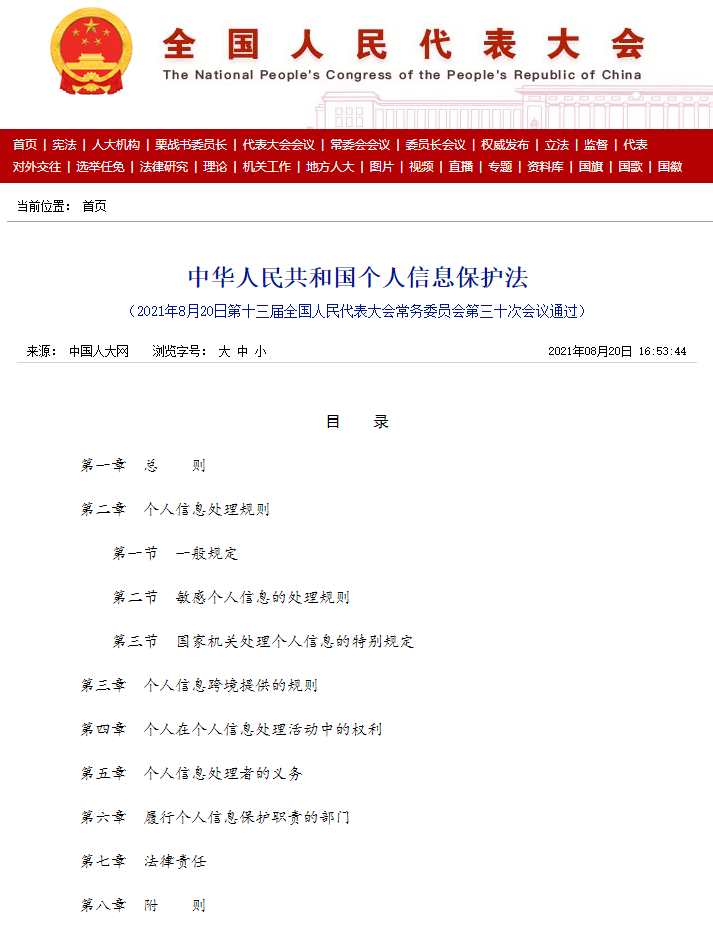 24 日消息 十三届全国人大常委会第三十次会议在 8 月 20 日表决通过《中华人民共和国个人信息保护法》,个人信息保护法自 2021 年 11 月 1 日起施行。