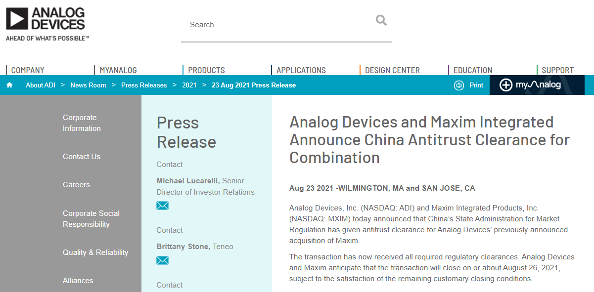 ADI 表示,该交易已经取得所有必要的监管机构批准。ADI 公司和 Maxim 公司预计在满足其余惯例成交条件后,此交易将于 2021 年 8 月 26 日左右完成。