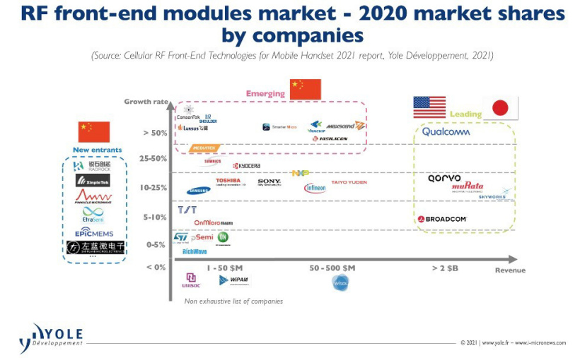 - 美国对华为出口管制以来,射频前端市场发生动荡,国产厂商开始起飞;